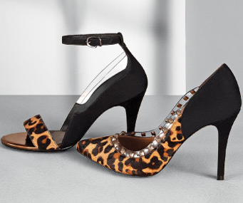 Sandália de couro metalizado e vinil com spikes (salto 9 cm) e scarpin de couro e nobuck (salto 8 cm) / Sandália de couro, nobuck e vinil (salto 8 cm) e scarpin de couro, nobuck e vinil com spikes (salto 10 cm):